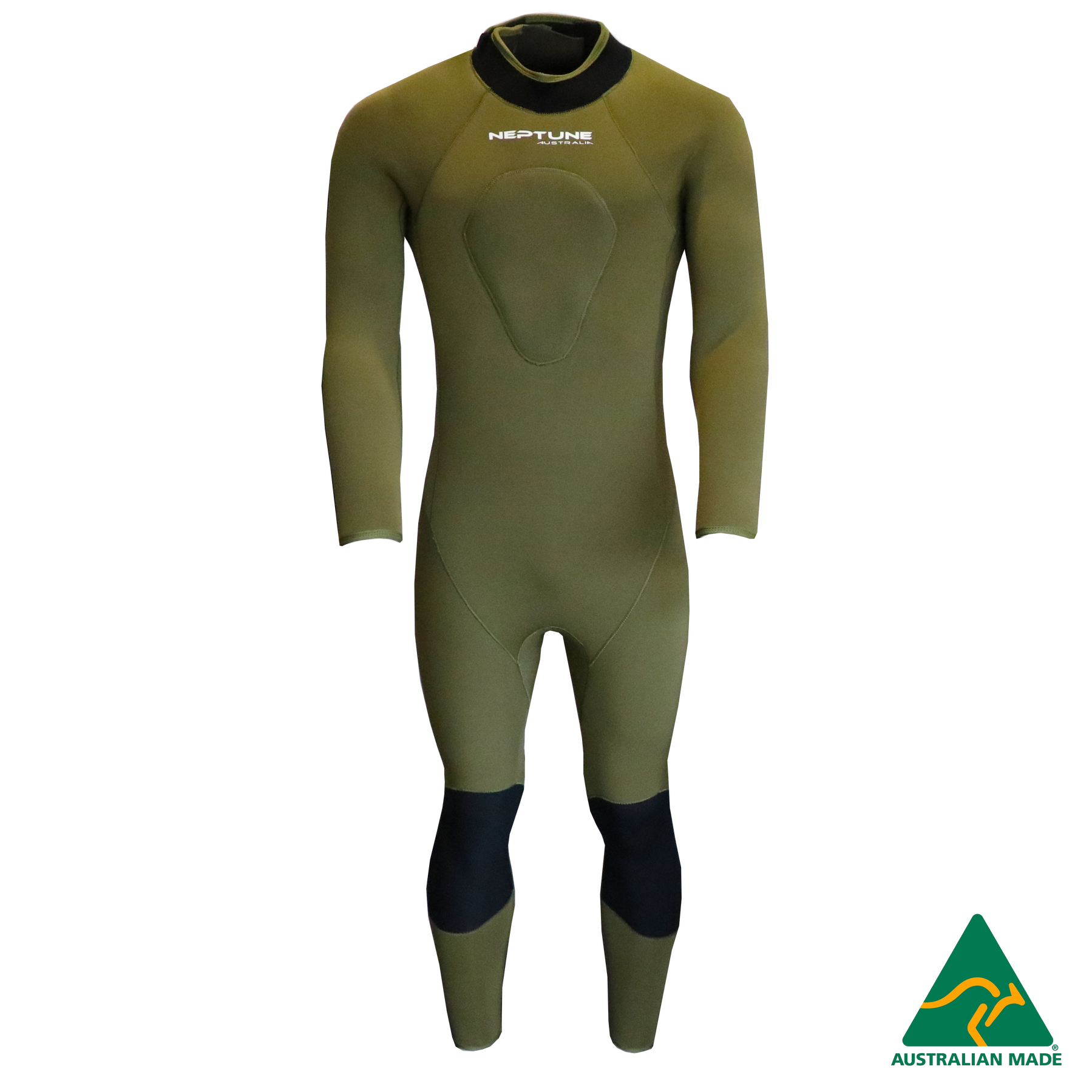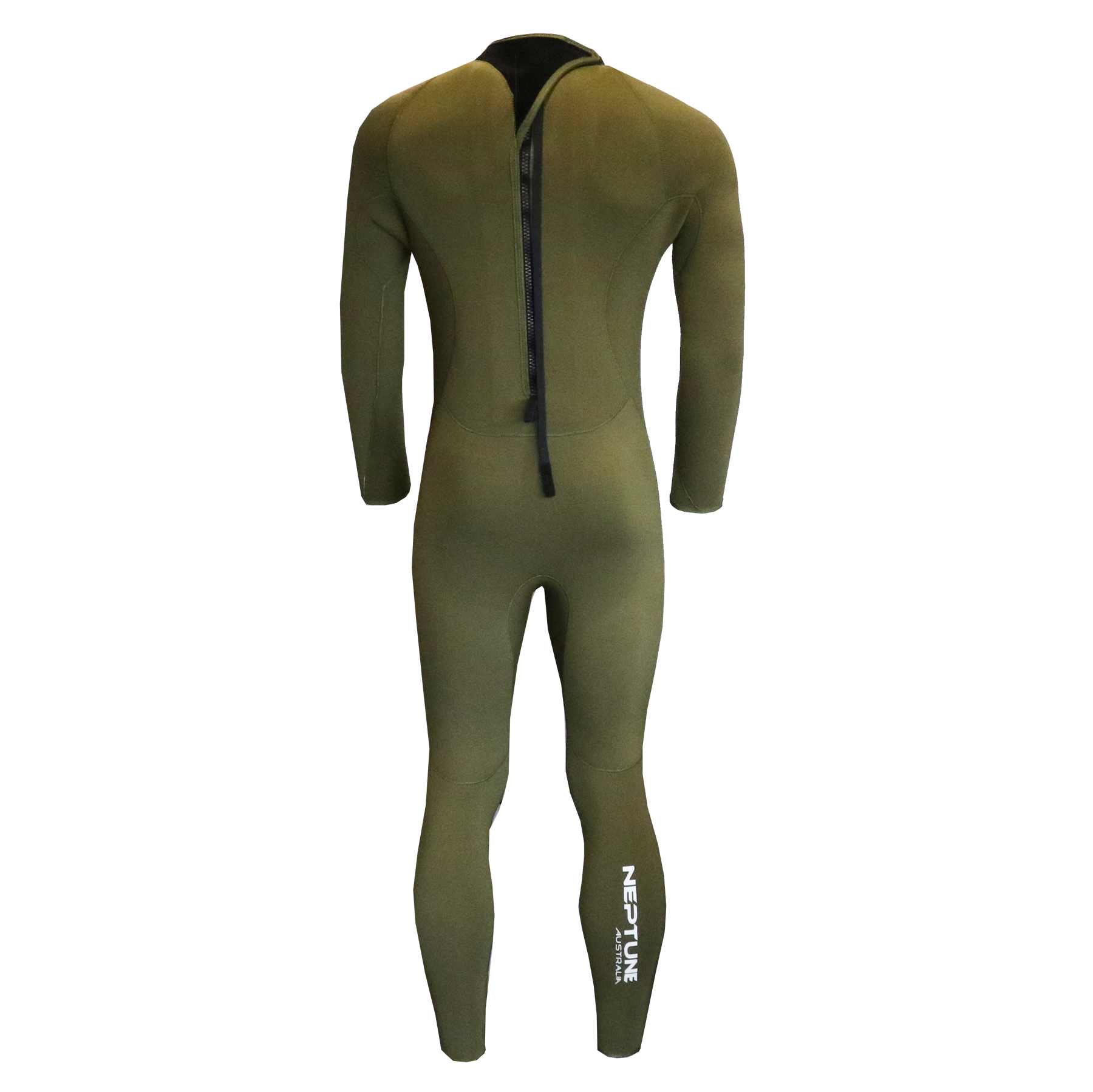 The Neptune Warrior once piece 5mm wetsuit steamer in neutral drab olive green is the perfect colour for a diver looking for mid water camouflage and who is spearfishing amongst weedy kelp bottoms along the southern coast lines around Australia.