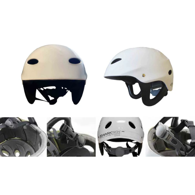 Lightweight, vented, dual density EVA helmet for water sports where onditions are dangerous and head protection is required or woul be sensible. Comes with internal size micro-adjustment, adjustable chin trap with buckle and removable ear protection. CE EN1385 certified for safety. UNISEX FIT